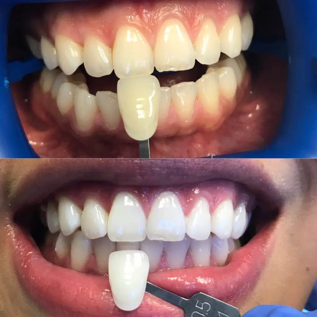 To begin the process, your dentist will clean your teeth, then protect your gums, cheeks, lips, and tongue from the whitener. Then, the whitener will be applied to your teeth and activated with a UV light, boosting its potency.